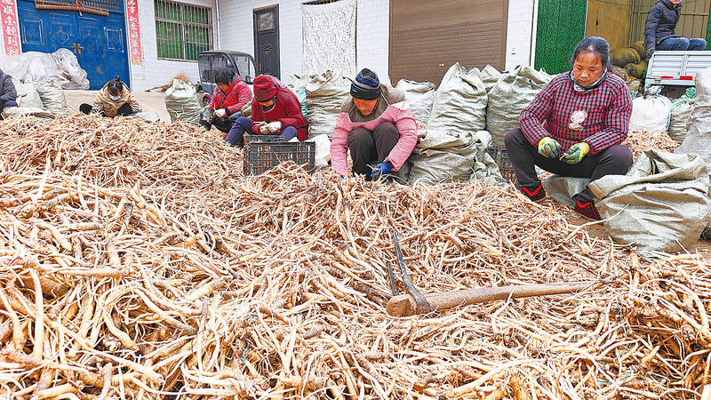 1月5日,商州区夜村镇高桥村村民在中药材收购点分拣新鲜桔梗,每日可收入劳务费80元左右。据了解,鲜桔梗今年收购价为每公斤4元,相比较去年有所下降。