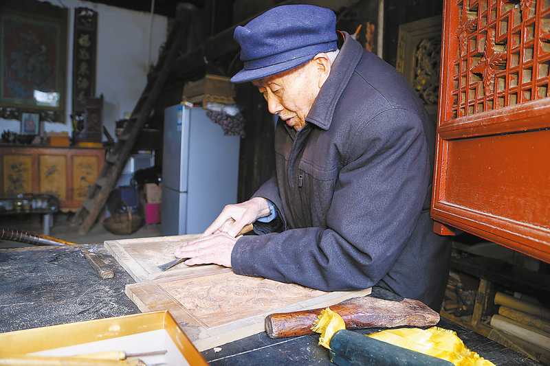 郭树寿雕刻插屏“我最喜欢的是花鸟、人物,我有时间了就做一做。心情好了,多做一些;心情不好了,少做一些。”1月4日,86岁的郭树寿老人说起木雕,满是皱纹的脸上挂满了笑容。
