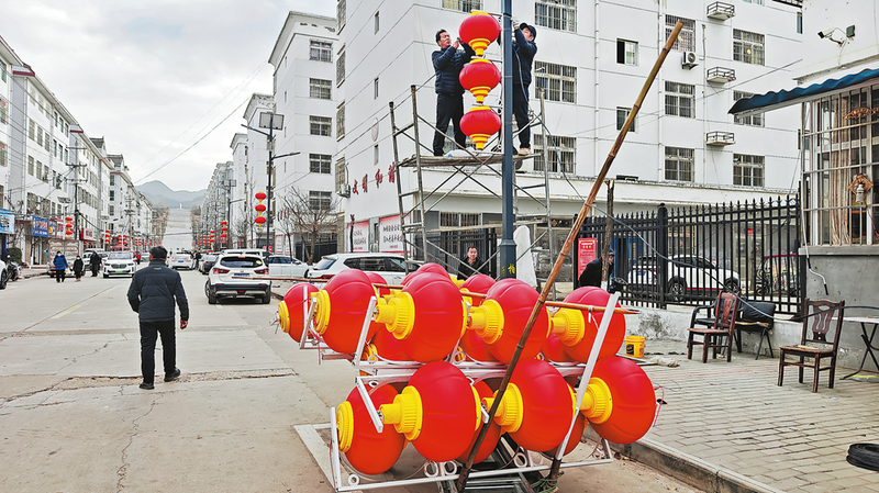 春节即将来临,为了营造欢乐祥和的节日氛围,连日来,洛南县古城镇在主要街道悬挂灯笼,让年味更近一点、更浓一些。 (本报记者 杨 鑫 摄)