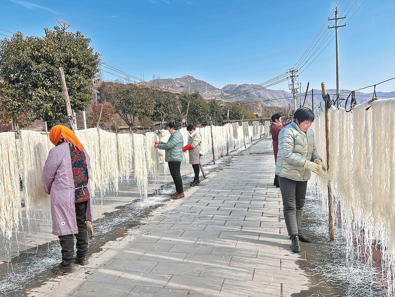 1月6日,在丹凤县竹林关镇洞底村,一排排粉条在阳光的映照下泛着光泽,工人们正忙碌地晾晒粉条。据悉,这些粉条是洞底村村民刘小梅加工制作的,她从事粉条加工已30多年,今年购买了5万多公斤红薯,雇了10多名工人帮忙,预计收入10万元。依靠粉条产业她不仅让自己的日子越过越红火,还带动周边群众通过务工增收。(本报通讯员 苏甜甜 摄)