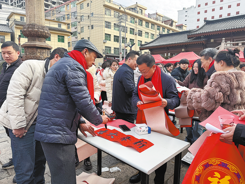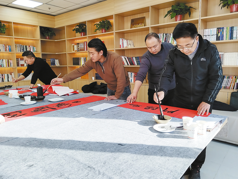 为落实文艺“六进”志愿服务活动要求,弘扬书法艺术,满足群众精神文化需求,1月11日,市文联组织部分中、省书协会员走进市交投公司开展义写春联活动,受到职工欢迎。(本报记者 王小伟 摄)