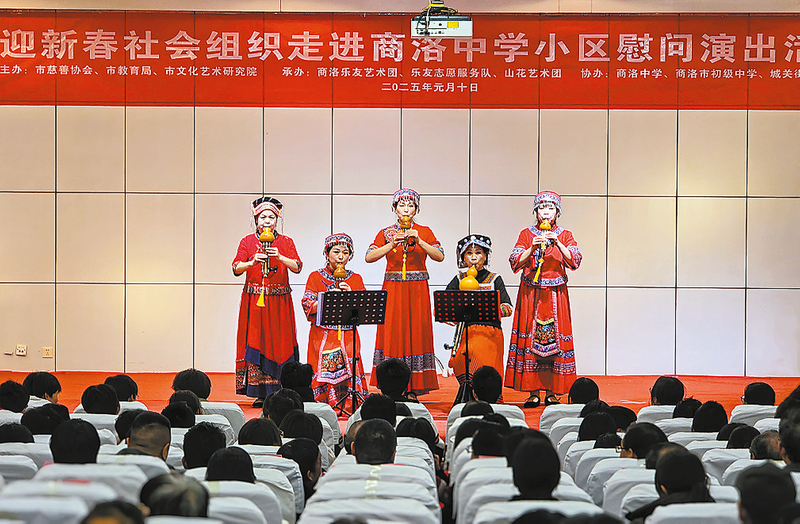 1月10日,市慈善协会、市教育局、市文化艺术研究院联合主办的“迎新春慰问演出”活动在商洛市初级中学举行,商洛市乐友艺术团、乐友志愿服务队、山花艺术团的演员为400多名师生表演了精彩的文艺节目,并送上新春祝福。图为乐友艺术团演员表演《唱得幸福落满坡》。 (本报见习记者 耿 锟 摄)