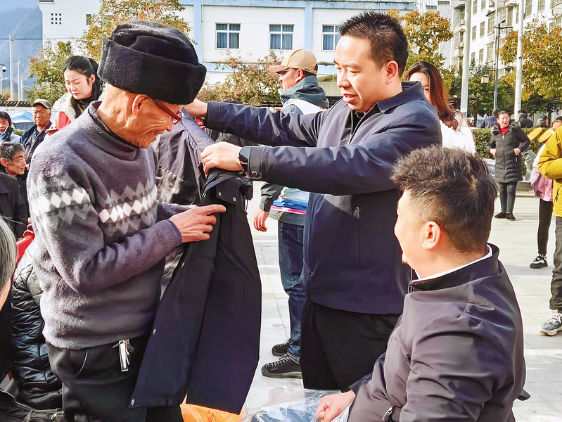 1月9日,中华社会救助基金会、商洛彩虹公益中心联合商洛瑞晶源新能源科技有限公司在丹凤县竹林关镇丹水社区举行“银天使计划——老有所衣”阳光公益活动,志愿者为老人们发放棉衣,提醒老人们做好自身防寒保暖,注意冬季用火用电安全。 (本报通讯员 赵书苑 摄)