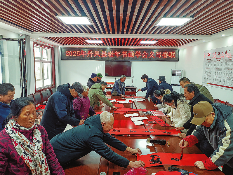 1月17日,丹凤县老年书画学会组织8名会员来到铁峪铺镇花魁村开展迎新年送文化到乡村活动,书画家们现场挥毫泼墨,为群众义写春联200多副,并为他们送去新春的问候与祝福。 (本报记者 贾书章 摄)
