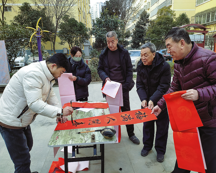 1月18日,商州区刘湾街道江南小区东区业委会和物业公司邀请市、区书法家为小区住户义务写春联350多副,活跃了小区文化生活,营造了喜庆祥和、热闹温馨的节日氛围。 (本报见习记者 孙远飞 摄)