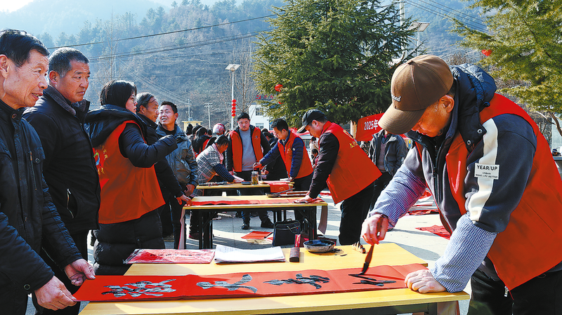 1月21日,丹凤县峦庄镇在文化广场开展“迎新春 赠春联”新年活动。来自商山书画院的5位书法爱好者现场泼墨挥毫,为当地群众赠送了700余副春联,为新春佳节增添了浓浓的喜庆氛围,也传递了对新年的美好祝福。 (本报通讯员 王盈琳 摄)