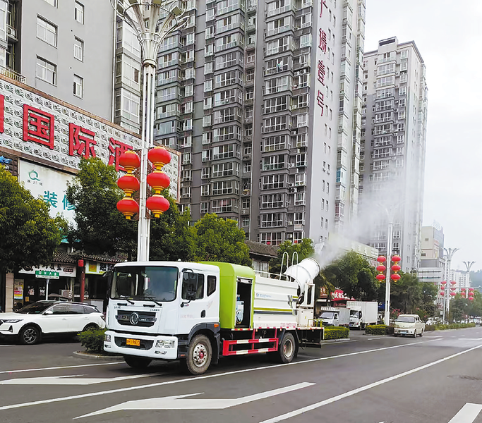 多功能抑尘车在城市街道作业“没有了尘土飞扬,现在空气越来越好了,经常能看到蓝蓝的天空,有时候感觉空气吸到嘴里都特别新鲜,很畅快、很舒心。”1月7日,商南县火车站富居城小区居民柳钰深有感触地说。