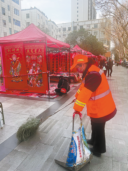 “现在临近春节,很多人都会在商城附近买年货,有时候这边刚扫完,转一圈又脏了,只有不停地清扫,才能保持干净。”面对不断增加的工作量,王慧芳没有抱怨,继续埋头苦干,清扫好路面她又拿出抹布,动作麻利地擦起垃圾箱。