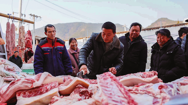 洛南县寺耳镇集市上的土猪肉热销