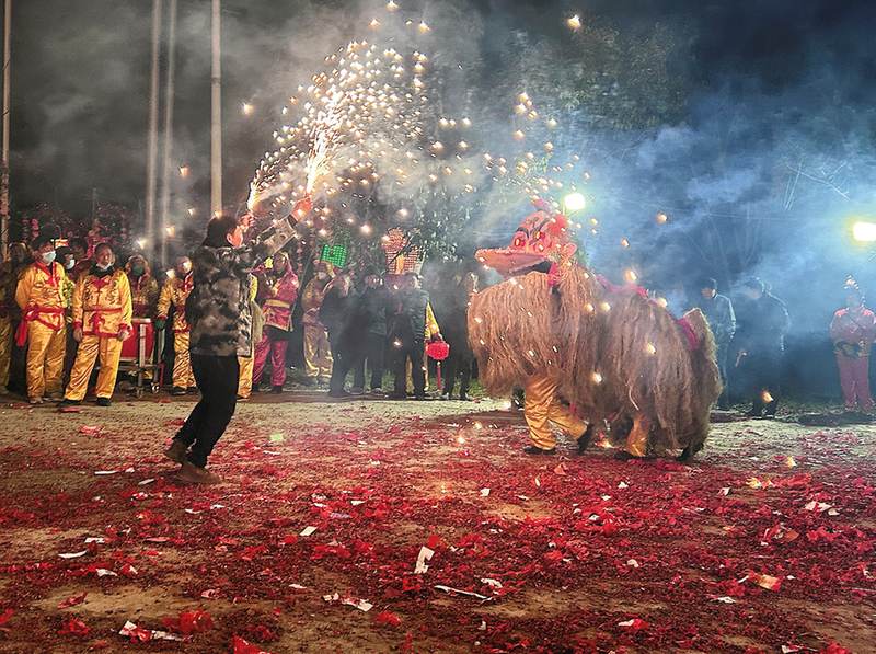 伴随着铿锵有力的锣鼓声和村民们的呐喊声,交织着此起彼伏的鞭炮声和绚烂绽放的烟花,舞狮人员闪亮登场,或跳跃,或盘旋,或仰卧,激昂的鼓点节奏明快,与舞狮动作完美契合,时而急促、时而舒缓,带动着现场的气氛不断升温。