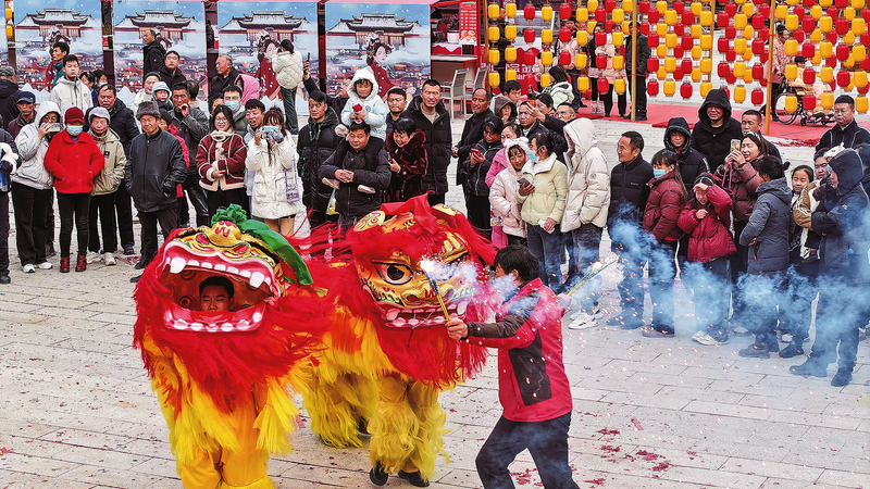 1月29日,在秦岭天竺山景区游客服务中心举办的舞狮表演吸引了众多游客驻足观看。