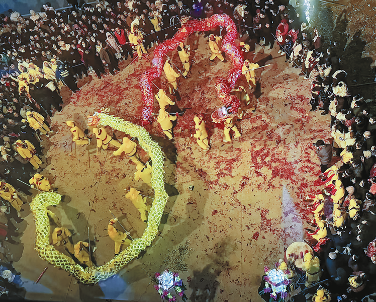 △2月10日至12日,柞水县下梁镇沙坪社区精心准备的舞瑞狮祥龙、划车船灯等社火表演在社区轮番上演,绚丽的民俗表演服饰和激昂慷慨的鼓点将春节气氛推向了高潮,让群众沉浸式感受传统文化的独特魅力。 (本报通讯员 陈 晨 摄)