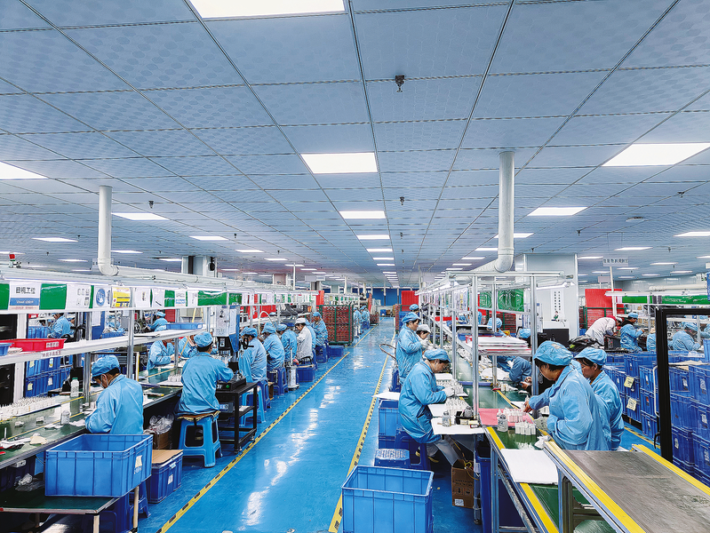 春节过后,山阳县各大企业陆续复工复产,开足马力,忙生产、赶订单,全力冲刺“开门红”。图为2月11日,在山阳县高新区的山阳瑞裕电子科技有限公司内,工人正在忙着生产电源适配器。(本报记者 南 玺 摄)