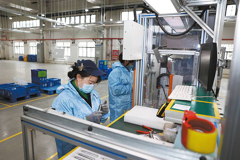 二月十一日,商洛比亚迪实业有限公司车间内,工人在有序忙碌着。据了解,该公司二〇二四年实现产值三十三点一九亿元,带动就业八千五百余人。二〇二五年春节期间,电解液、隔膜纸、方向盘等项目持续生产,二月一日全面复工复产,预计今年可实现产值三十七亿元。 (本报记者 李 敏 摄)