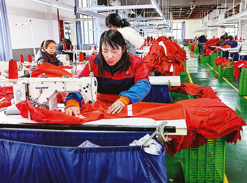 春节过后,洛南县相关单位工作人员积极深入县内工矿企业、社区工厂和就业帮扶基地督查了解复工复产情况,宣传恵企利民政策,协助解决企业生产、用工方面的问题,促进企业顺利复工复产。图为2月18日洛南县金翼服装有限公司生产车间内群众正在加工服装。 (本报通讯员 刘卫锋 摄)