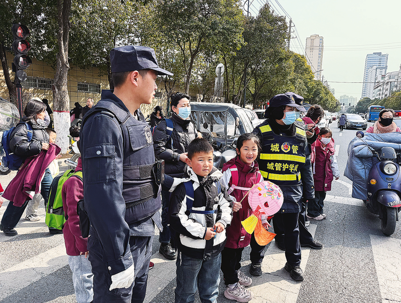 自春季开学以来,市公安局商州分局巡特警大队和城管部门派出队员,在上放学高峰时段护送学生安全过马路,为学生撑起“平安伞”。图为2月17日巡特警、城管工作人员在商州区第二小学附近护送学生过马路。