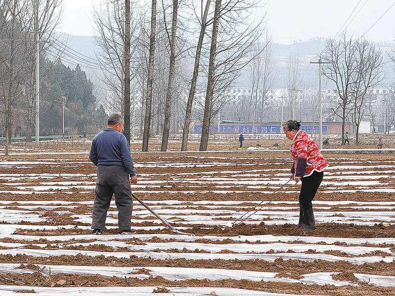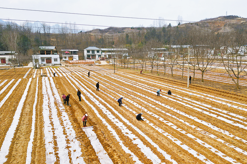 村民正在给土豆覆膜早春2月,寒意还未完全退去,山阳县高坝店镇的田野间却已涌动着蓬勃的生机。2月19日,高坝店镇过风楼社区的马铃薯集中连片示范田里,一片热火朝天的景象。村民弯着腰,熟练地给土坑里施肥,随后迅速把土豆种放进去,动作一气呵成,之后,给土豆种覆盖上塑料薄膜,他们深知农时不等人,每一分每一秒都关乎着一年的收成。