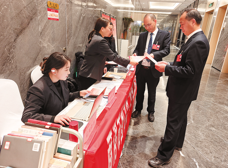 2月26日,商洛市图书馆工作人员在会议现场设立两会信息服务点,委员只需扫描二维码便可以查阅33个专题类别的相应资料以供参考。(本报记者 杨 鑫 摄)