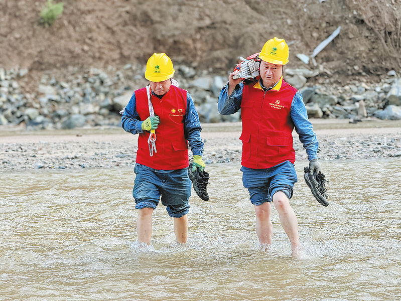 △国网商洛供电公司共产党员突击队队员徒步巡视水毁线路设备
