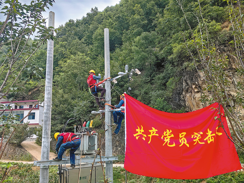 ▷国网商洛供电公司共产党员突击队进行立杆、安装变压器及成套设备工作