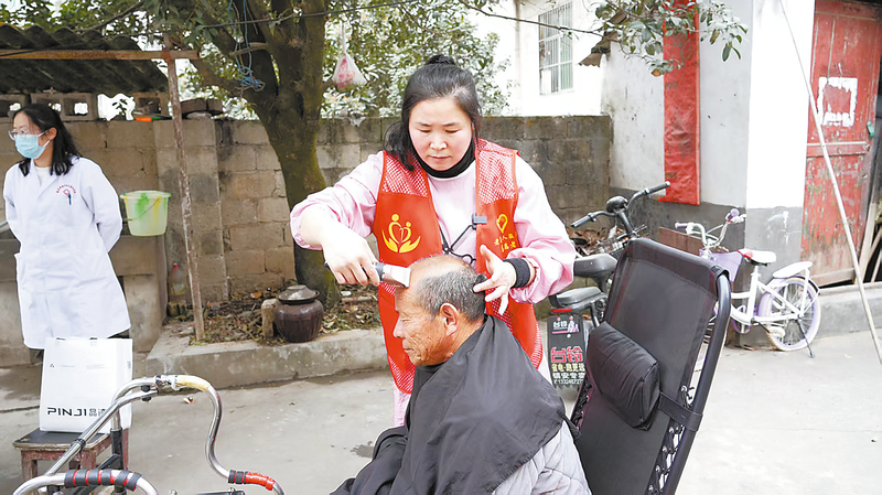 △2月28日,镇安县老龄事业服务中心联合永乐街道青槐社区、新城中西医结合医院共同开展“银龄行动”志愿服务活动,为老人理发、打扫室内外卫生、整理生活物品,并开展健康体检及评估工作。 (本报通讯员 夏泽梅 摄)