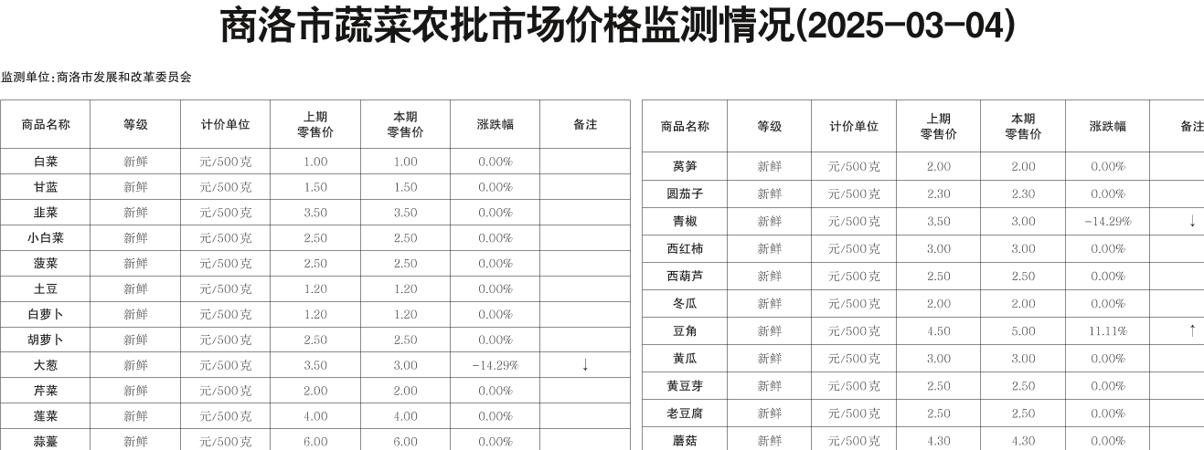 商洛市蔬菜农批市场价格监测情况(2025-03-04)
