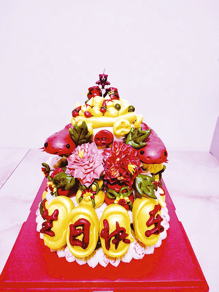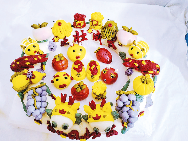 在花馍的造型上,除了传统的龙、凤、虎、花、鸟、鱼、虫等,凤秀芳还结合网上流行的式样,不断推陈出新,让人眼前一亮。“比如说为老人过寿做的花馍,我一般会像做蛋糕一样做二三层,福袋代表有福,石榴是百子百孙,还有桃子,寓意健康长寿,这些元素都是手捏出来的。”凤秀芳说,她还在网上买来印字的模具,最后在花馍上镶嵌“生日快乐”“平安喜乐”“百年好合”一类的祝福语,起到了画龙点睛的作用。