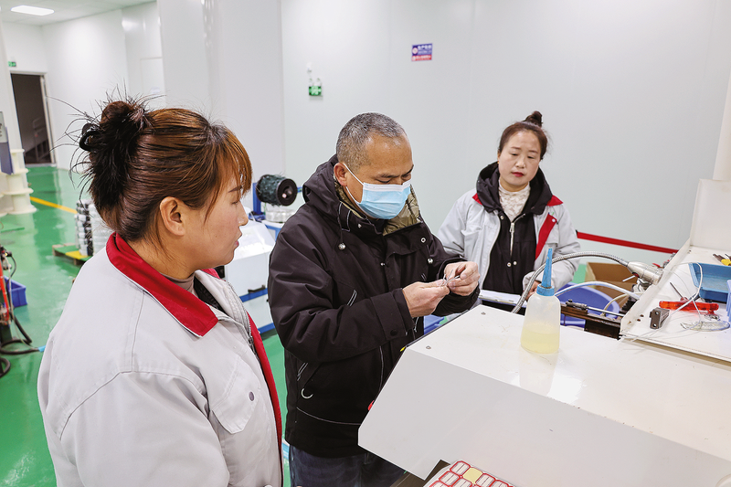 3月4日,在山阳县高坝店镇富桥社区的商洛丰阳坤鹏工贸有限公司的车间内,工人正在生产电子元件,目前公司已带动114户群众就业增收。 (本报记者 谢 非 摄)