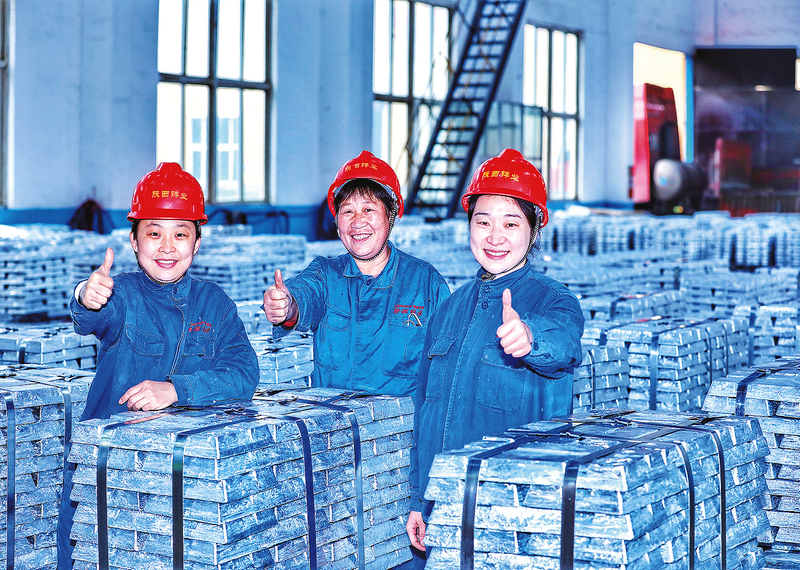 3月4日,陕西锌业有限公司电锌车间内,女职工们摘下口罩护具,在自己的劳动成果前露出自信笑容。