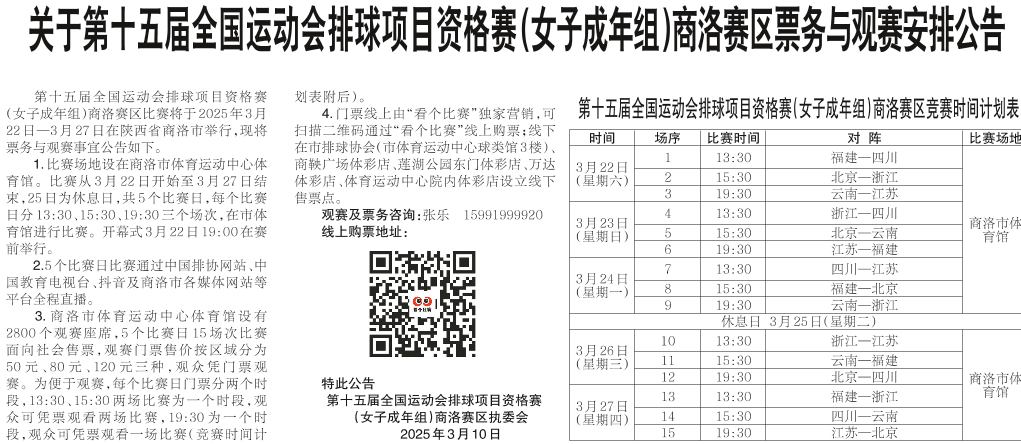 关于第十五届全国运动会排球项目资格赛(女子成年组)商洛赛区票务与观赛安排公告