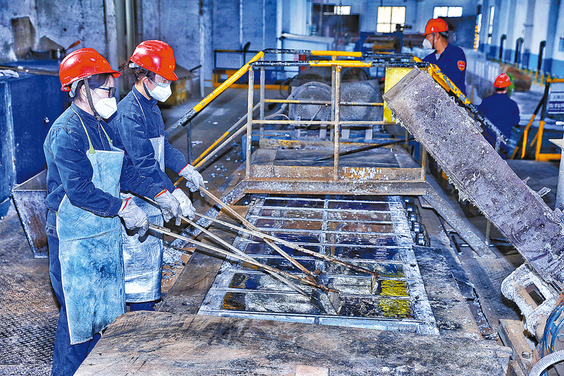 面对400℃高温,女职工淡定地完成锌锭表面预处理工作。3月4日,记者走进陕西锌业有限公司电锌车间,迎面而来的是一股热浪。在室外气温只有2℃的情况下,这里显得格外暖和。有三个篮球场大小的生产车间里,只见一个机械手臂,将刚出炉冷却后呈长方形的成品锌锭搬运至右方成品放置区域。打包好的成品锌锭一眼望去,像一座座由银色砖块堆砌的方形魔方银光闪闪。沿左侧生产区域的楼梯而上,温度也随之升高,两名女工全副武装,正手持工具在刚刚流入模具的400℃高温液体锌上进行锌锭表面预处理工作,工具在高温的作用下不时冒出阵阵烟雾。
