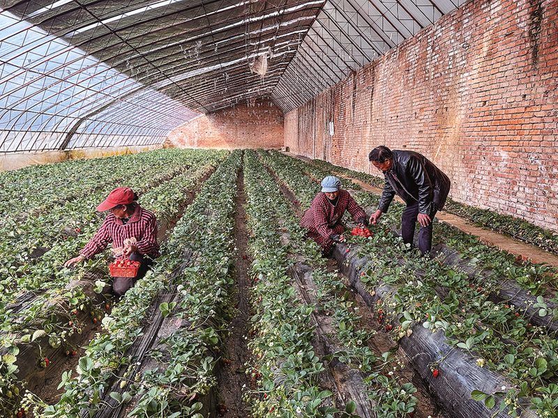 务工人员在采收草莓春暖花开,万物复苏。商州区麻街镇仙湖蔬菜种植农民专业合作社里也是一派勃勃生机。负责人李三民和技术员程周海探讨完中药材种植技术后,来到草莓大棚里,将大棚顶上的电动棉被卷起来。“现在天暖了,棚里气温太高对草莓不好。”李三民说。