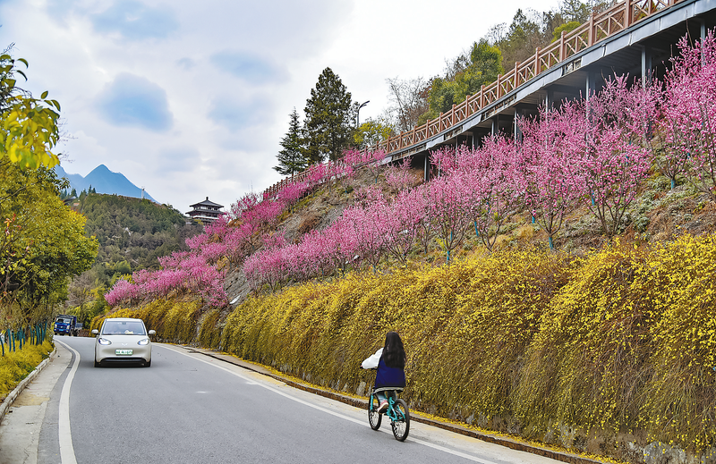 时下,正是赏春好时节,镇安县绣屏公园的梅花和迎春花竞相绽放,铺满大地,宛如一幅绚丽的油画。游客漫步其中,感受着春天的气息与自然的馈赠,仿佛置身于梦幻的花之仙境。 (本报记者 马泽平 摄)