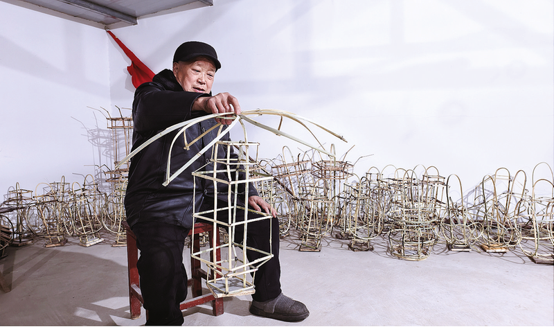 汪祥家说,他从十几岁时,就跟随本家的叔叔伯伯学习花灯的制作技艺,这一扎就是60多年。起初,他是照着长辈们做的灯样儿扎,一个像样的花灯架子,有时要做四五遍。凭借着浓厚的兴趣和坚韧的毅力,加之不断地摸索创新,到如今,只要是脑海里想出来的事物,他都能扎得出来。