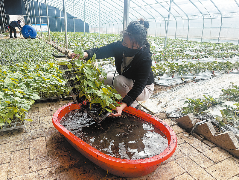 三月十六日,洛南县三要镇北司村的蔬菜大棚内村民正在开展西葫芦、黄瓜、甜瓜等蔬菜育苗工作,采用科学管护确保苗齐苗壮。所育种苗由洛南县农百鲜种植专业合作社分配种植,发展西红柿、西葫芦、贝贝南瓜等多品种蔬菜,将有力推动北司村蔬菜产业发展,为乡村经济增长注入活力。(本报记者 王孝竹 摄)