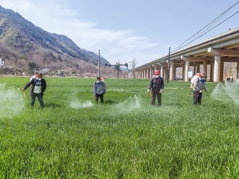 3月19日,柞水县凤凰镇金凤村麦田化学除草作业正在有条不紊地展开。此次作业覆盖全村260亩麦田,采用人工喷洒与无人机喷洒协同配合的模式,为小麦生长打牢坚实基础。 (本报通讯员 孟晓梅 摄)
