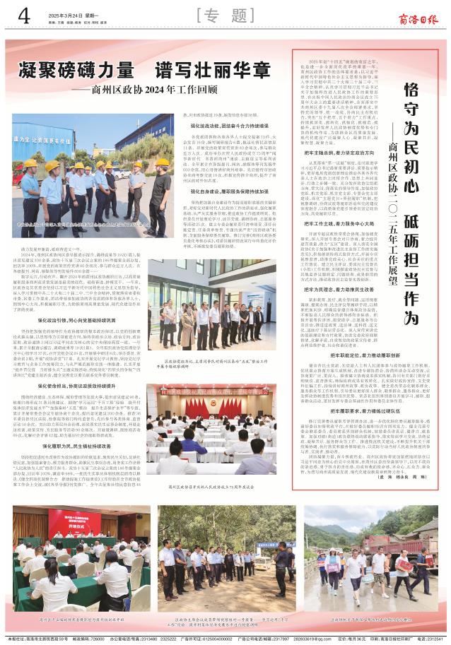数字无言,行动有声。翻开2024年的商州区政协履职日历,以高质量履职服务商州高质量发展是最美的底色。砥砺奋进,拼搏实干。一年来,区政协及其常委会坚持以习近平新时代中国特色社会主义思想为指导,深入学习贯彻中共二十大和二十届二中、三中全会精神,贯彻落实省委和市委、区委工作要求,团结带领参加政协的各党派团体和各族各界人士,围绕中心大局,积极履职尽责,为助推商州高质量发展、现代化建设作出了新的贡献。