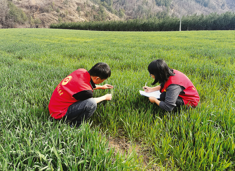 连日来,随着气温回升,冬小麦进入快速生长阶段,气象条件对其生长发育至关重要。商州区气象局工作人员走进田间对小麦的生长状况进行实地调查,并结合近期气象数据,为农户量身定制气象服务方案,助力今年夏粮丰收。 (本报通讯员 郑亚宁 摄)