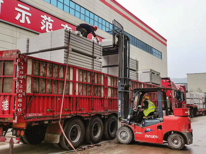 装满物料的模具经蒸养车运至静养室,在高温高湿环境中发泡膨胀,形成多孔状轻质坯体。随后,坯体被送入切割机组,像裁缝裁剪布料般被分割成标准尺寸。“切割废料会循环进入下一轮生产,真正实现零浪费。”马勇介绍,最终,经过高压蒸汽养护的ALC板材兼具轻质高强、防火保温等特性,成为工业厂房和民用建筑的内外墙优选。