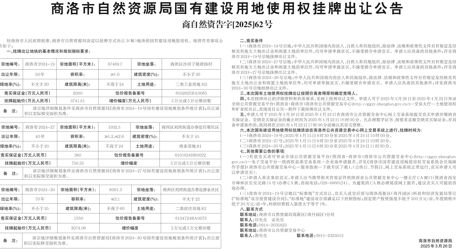商洛市自然资源局国有建设用地使用权挂牌出让公告