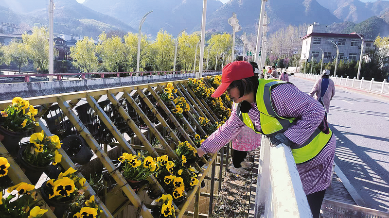 连日来,丹凤县园林工人在通往桃花谷的跨河大桥上精心布置鲜花,数万盆鲜花交织成绵延的花带,以迎接八方游客。(本报通讯员 张 宁 摄)