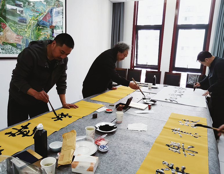 3月25日,商洛市文联组织文艺工作者走进市交投公司,开展“仓颉墨脉·通衢丹心”活动,用书画艺术丰富企业文化内涵,增强企业员工的文化自信与创新能力。图为书画家在创作书画作品。 (本报记者 王小伟 摄)