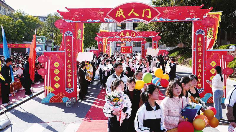25幅代表不同班级的标语入场,学生们执旗阔步,气势豪迈,向高考发出有力宣战。1000多名高三学生依次穿过象征成长阶段的襁褓门、总角门和成人门,标志着正式迈向成年,踏上新征程。