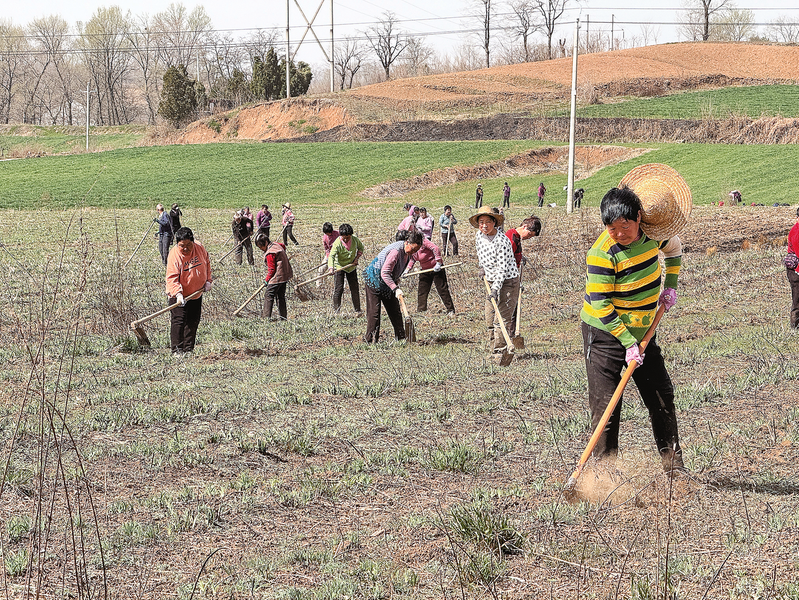 三月二十六日,洛南县永丰镇赵川村黄花菜种植基地里,村民们正抢抓春季作物管护有利时机,有序开展田间除草作业。(本报记者党率航 摄)