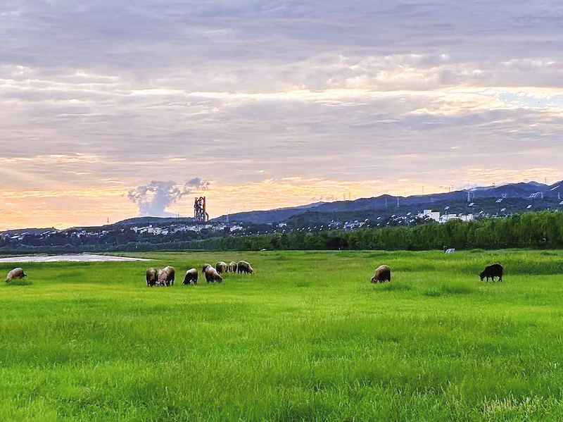 草长莺飞的季节,在丹凤县商镇商山村,橙色晚霞在天空中熠熠生辉。一片绿色的草地上一群羊儿正悠闲地享受着大自然的馈赠。在飞机场外,巍峨的秦岭山峦形成了一道天然保护屏障。秦岭生态保护,正是为了守护这样宁静而美丽的自然景致,让每一寸土地都成为人与自然和谐相处的典范。 (本报通讯员 陈 楠 摄)