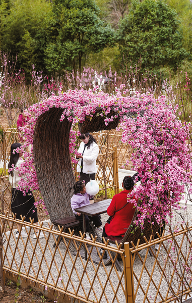 游人在“桃花心”休憩、打卡3月28日,丹凤花开邀您来——2025年陕西丹凤康养旅游宣传推介活动在丹凤县竹林关镇桃花谷启动。