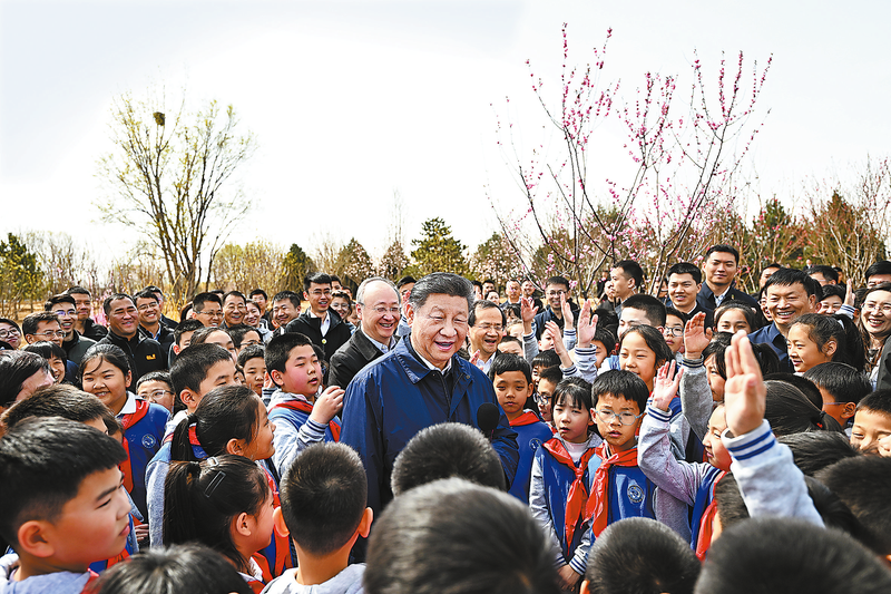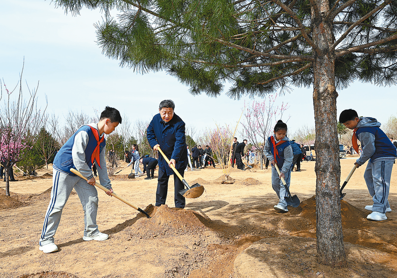 4月3日,党和国家领导人习近平、李强、赵乐际、王沪宁、蔡奇、丁薛祥、李希、韩正等来到北京市丰台区永定河畔参加首都义务植树活动。这是习近平同在场的干部群众、少先队员亲切交谈。 (新华社记者 燕 雁 摄)新华社北京4月3日电 中共中央总书记、国家主席、中央军委主席习近平3日上午在参加首都义务植树活动时强调,植树造林是生态文明建设重要一环。各地区各部门要进一步行动起来,动员组织广大干部群众积极参与造林绿化,践行绿色发展理念,弘扬生态文化,汇聚共建美丽中国的磅礴力量,让祖国大地更加绿意盎然、生机勃发。