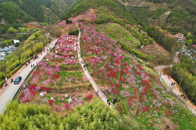 春暖花开,正是踏春赏景好时节。连日来,丹凤县竹林关镇桃花谷的千亩桃花相继盛开,吸引众多游客前来踏青赏花,享受春日好时光。 (本报记者 李小龙 摄)