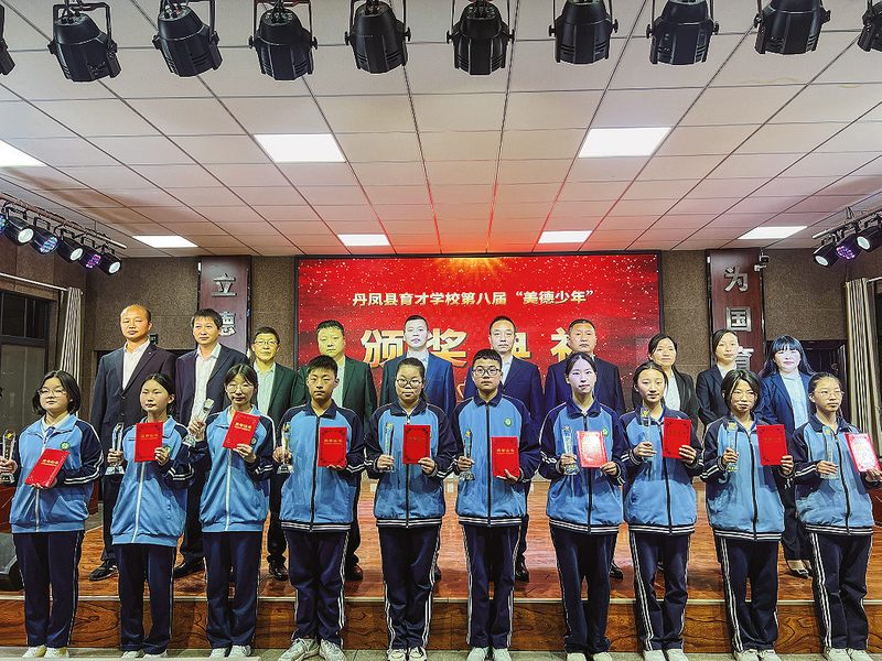 为全面落实“德智体美劳”教育方针,4月9日,丹凤县育才学校举行第八届“美德少年”颁奖典礼,对评选出的2024年度“敬老孝心”“助人为乐”“勤奋好学”等10名“美德少年”进行表彰。 (本报通讯员 彭书才 摄)