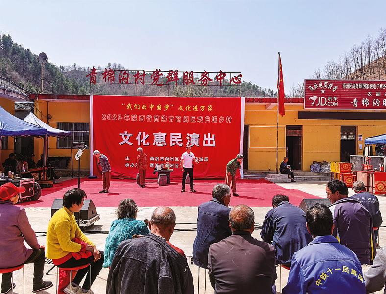 4月3日,由商州区文旅局主办,区文工团承办的2025年陕西省商洛市商州区戏曲进乡村“文化惠民演出”在夜村镇青棉沟村党群服务中心举行。现场,演员们为群众送上了商洛花鼓、秦腔演唱、板胡独奏等精彩的节目,赢得现场观众阵阵掌声。活动不仅丰富了群众的文化生活,也让大家近距离感受到戏曲艺术的独特魅力。 (本报记者 方 方 摄)